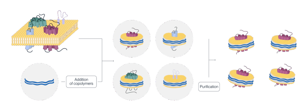 KACTUS社ではナノディスクの製造を効率化するため、独自のコポリマーを開発しました。この独自の両親媒性コポリマーは膜タンパク質の安定化と、界面活性剤を使用しない可溶化を可能にし、製造品質、性能、信頼性を確保します。
